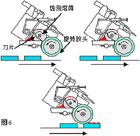 滾印技術(shù)是源于凹版印刷,兩者均普遍使用于圓柱表面或連續(xù)印刷平面物件。這種機(jī)型采用滾動式的矽膠頭和滾筒式鋼板,油墨會從油盤或經(jīng)管道覆蓋圖案,然后刀片再把多余的油墨刮去。當(dāng)滾筒旋轉(zhuǎn)時,膠頭就能從鋼板上取得圖案,然后移到物件上。(圖6)
