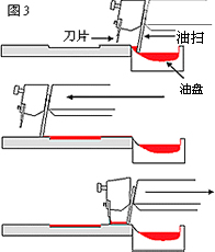 在這個設(shè)計(jì)中,油墨是放于鋼板后的油盤里(圖3)。印刷時,油墨會被油掃刮到鋼板上。這時候,油盤會被這個橫移的組件遮蓋,減少溶劑揮發(fā)。油盤實(shí)際上沒有完全被覆蓋,但卻能阻止溶劑揮發(fā)。比較開放式油盤,油墨濃度更穩(wěn)定,作用亦更持久。
