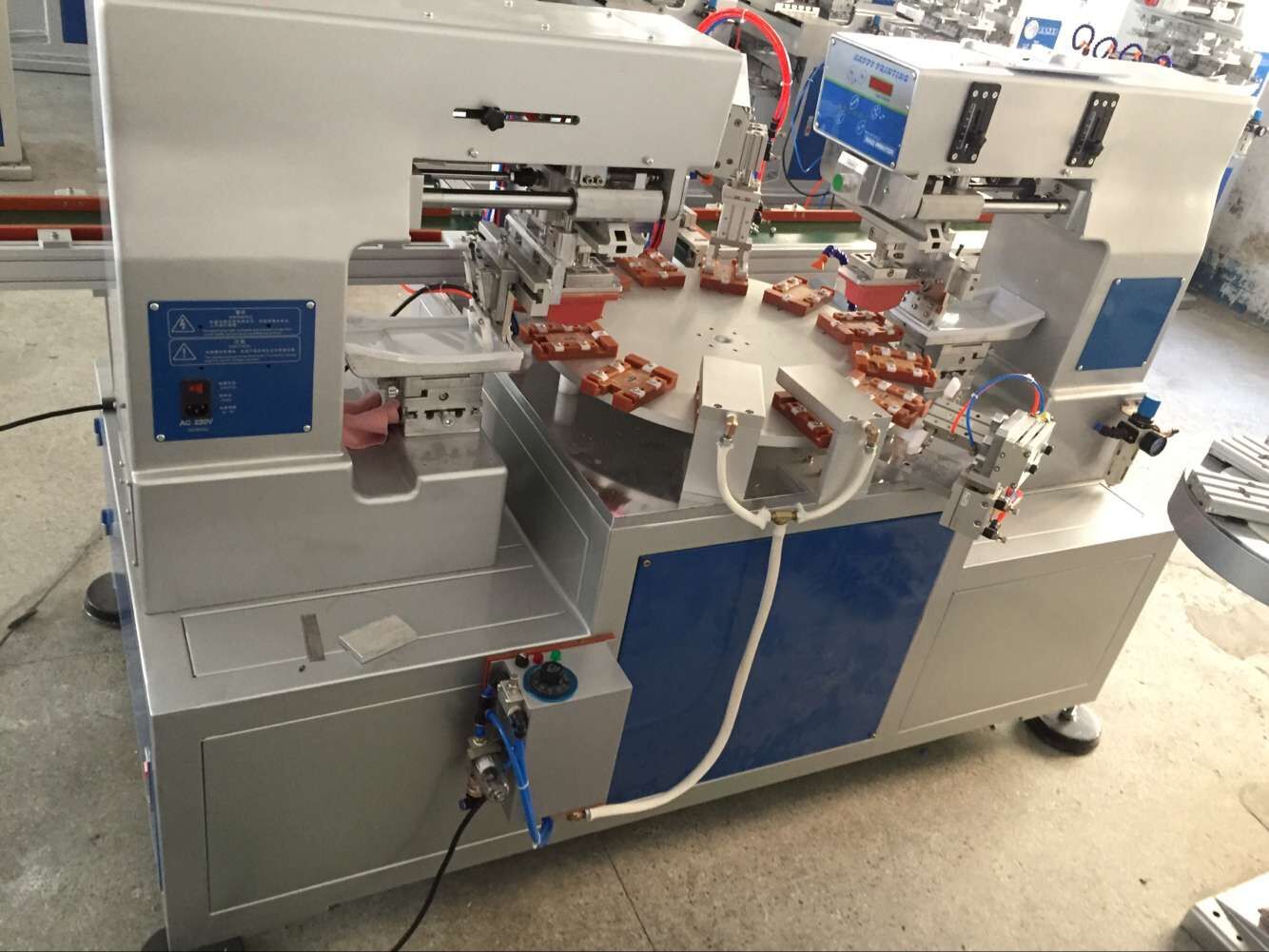 1、 印刷速度比轉(zhuǎn)盤機(jī)慢,但印刷工件可以大一些,四個(gè)顏色一次套色印刷完成。